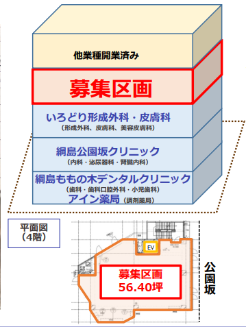| 面積 | 2~5階:56坪/1階:48坪を薬局と分割予定 |